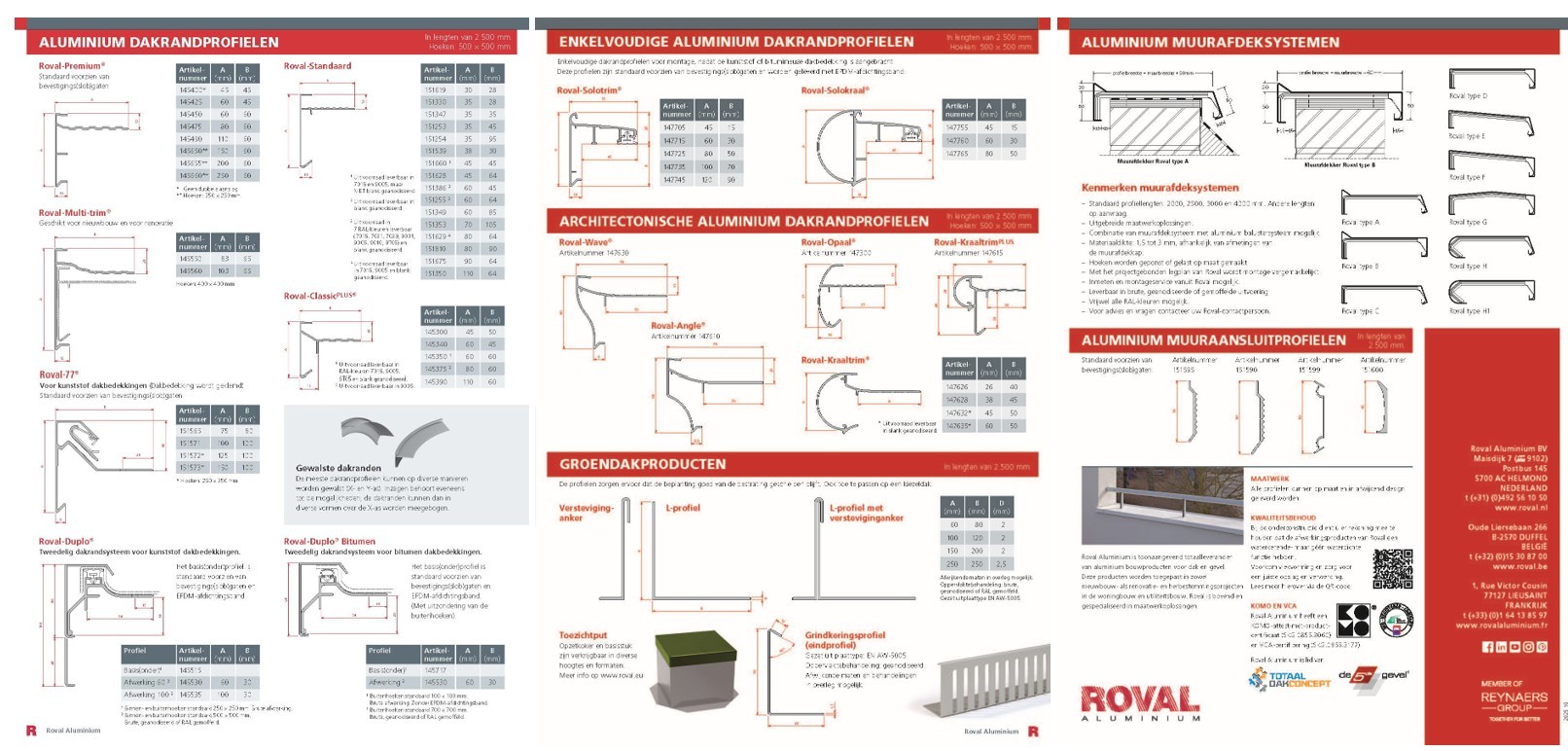 Nu verkrijgbaar: het nieuwe leaflet Aluminium Dakproducten van Roval Aluminium. Deze brochure biedt een helder overzicht van aluminium dakrandprofielen, muurafdeksystemen, groendakoplossingen en muuraansluitprofielen. Alle producten zijn duidelijk gerangschikt en voorzien van technische informatie en tekeningen.