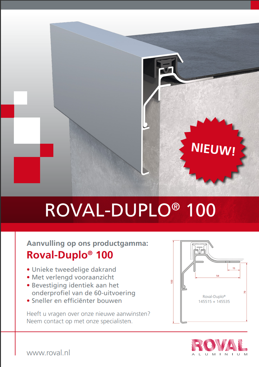 Roval Aluminium breidt het programma aluminium dakranden uit met de Roval-Duplo® 100. Daarmee heeft de Duplo-serie een variant met een grotere afdekking naast de inmiddels veel toegepaste Roval-Duplo® 60. Opdrachtgevers vragen steeds vaker om grotere afdekmaten. Met 60 én 100 mm kies je per detail precies de afdekking die nodig is, zonder een ander systeem te hoeven toepassen.