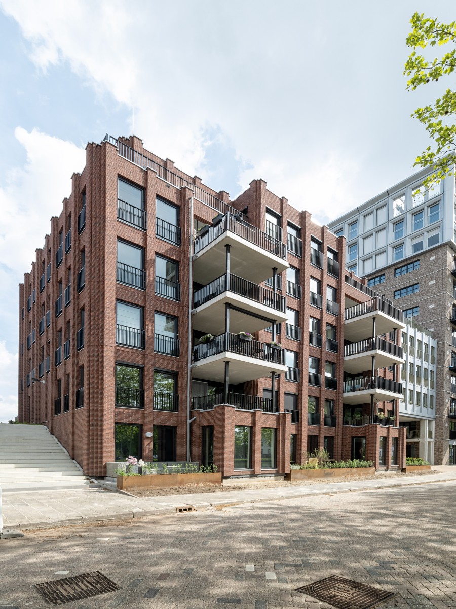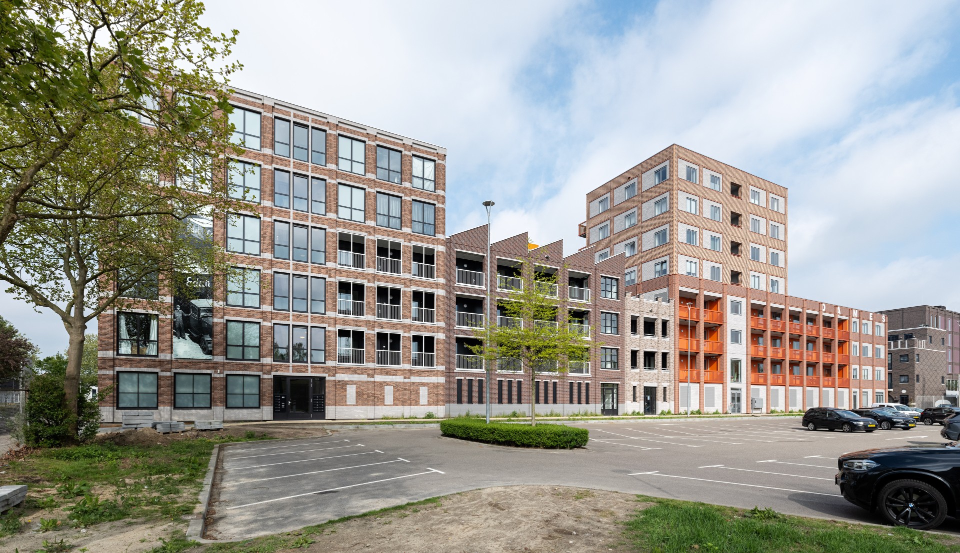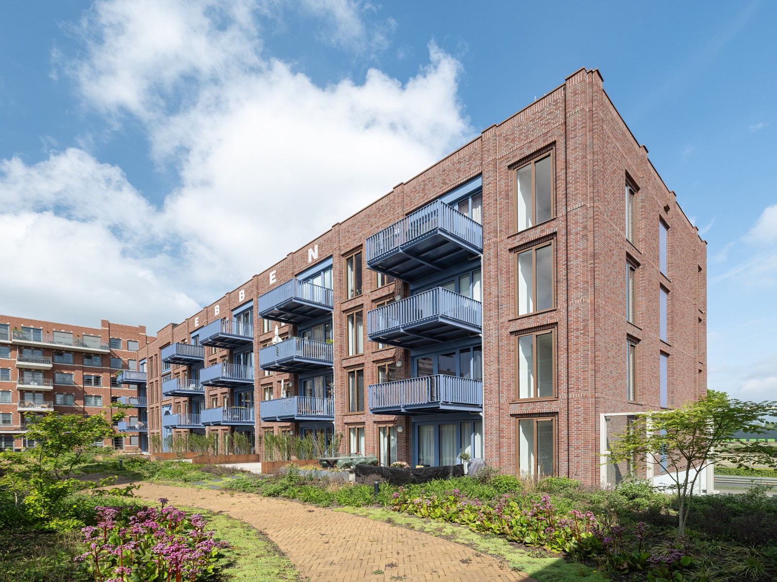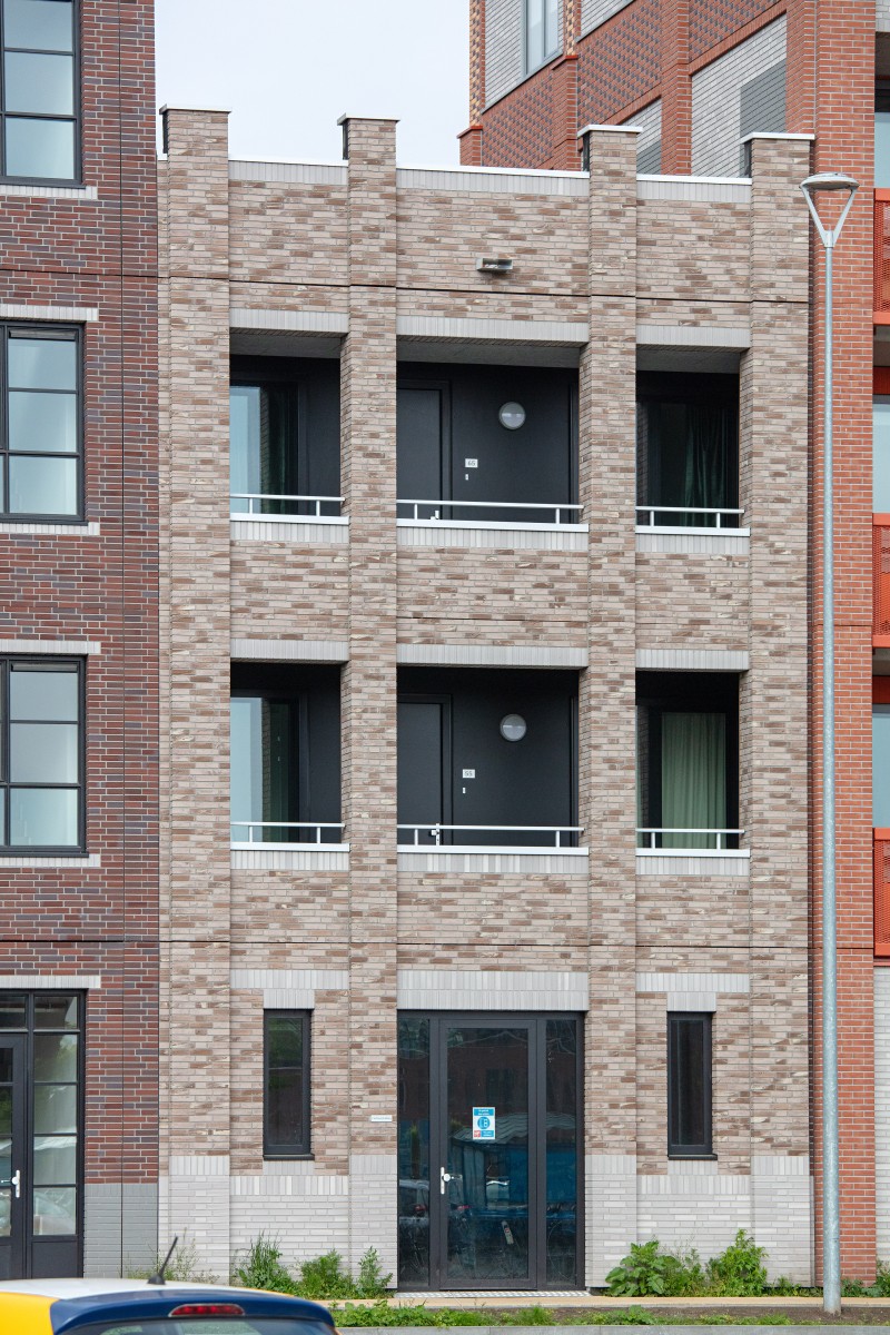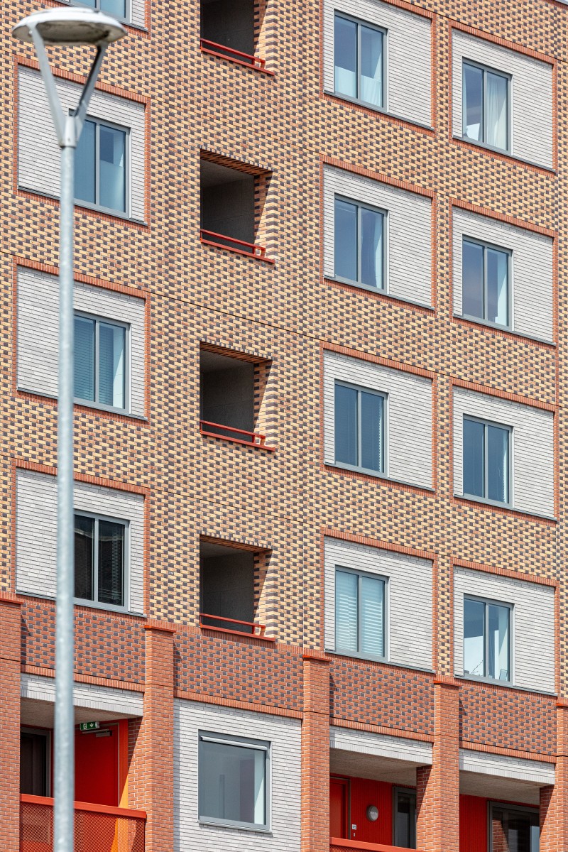 Het wooncomplex bestaat uit dertien woonblokken die samen een heldere eenheid vormen, maar toch elk een eigen karakter bezitten. “We hebben gestreefd naar variatie binnen samenhang”, merkt Verbeek op. “De breedte maatvoering van de woongebouwen aan het kanaal is nagenoeg gelijk, geïnspireerd op de breedte van het monumentale EDAH-gebouw. Dat zorgt voor ritme en herkenbaarheid.”