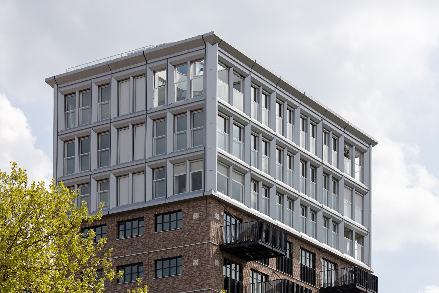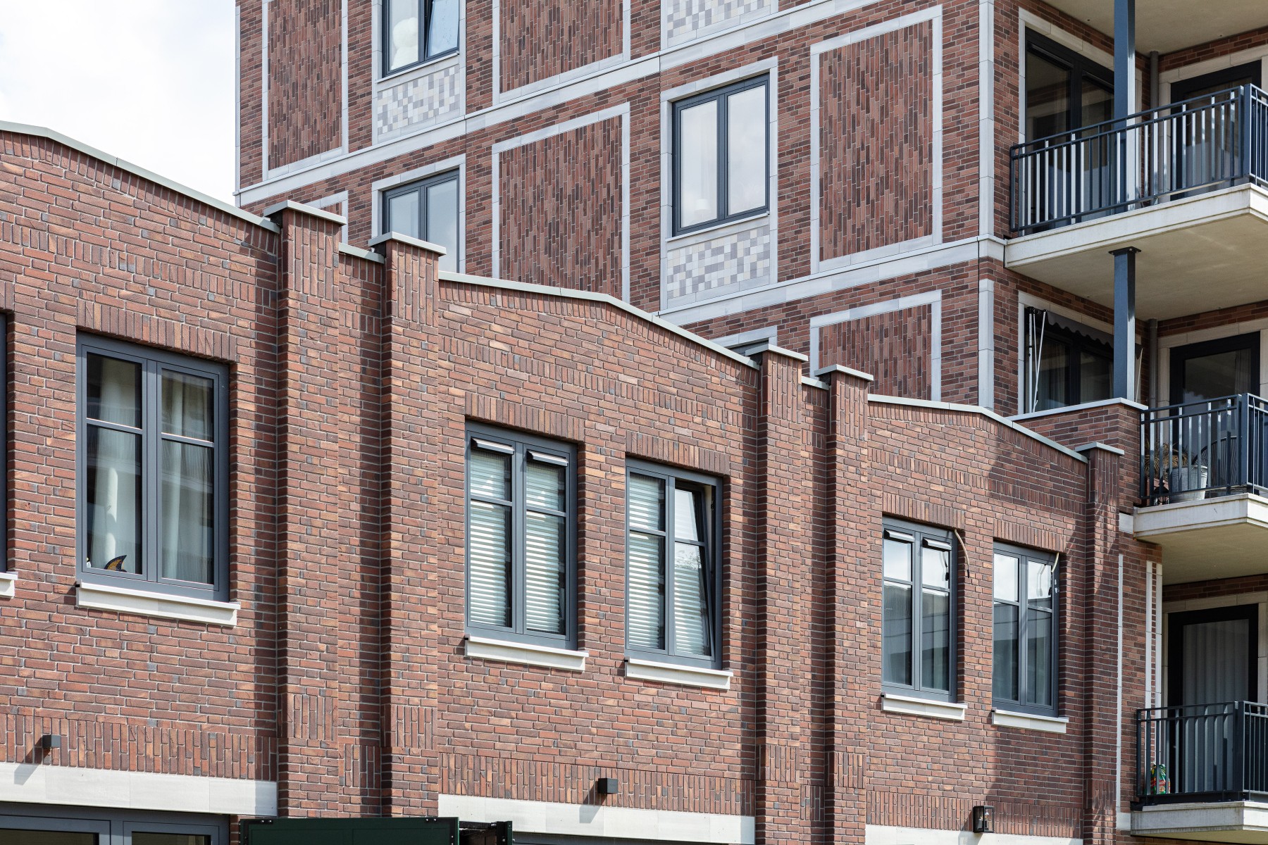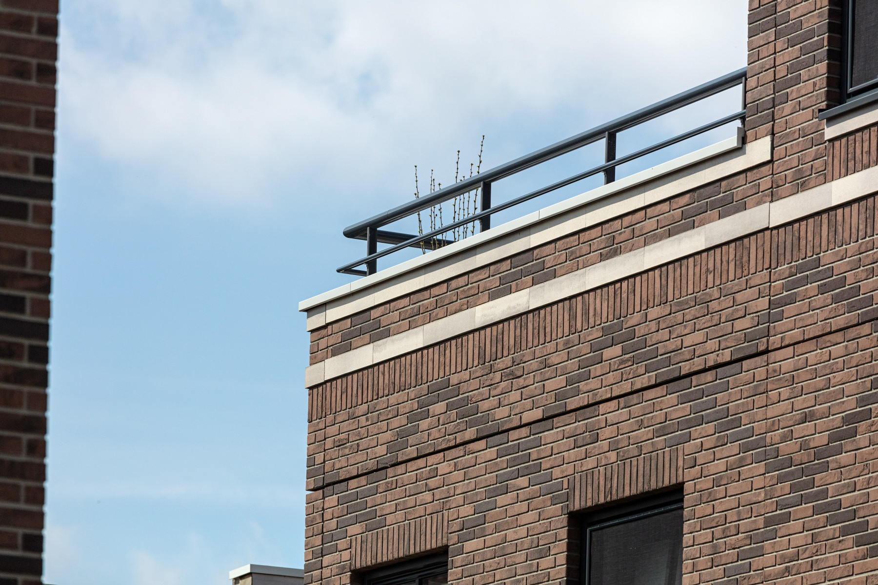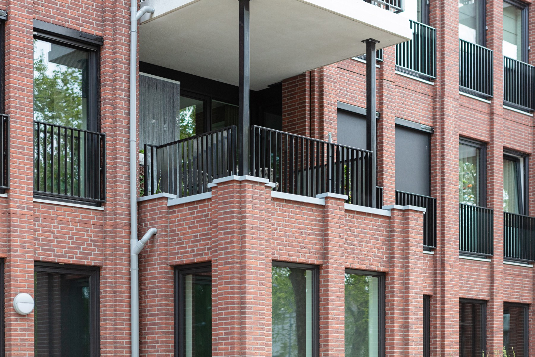 Voor de waterslagen en muurafdekkappen koos Joost bewust voor aluminium vanwege het gemak waarmee het materiaal gedetailleerd kan worden. De aluminium muurafdekkappen zijn op sommige locaties voorzien van balusters met railing, soms drie boven elkaar. “Aluminium muurafdekkappen zorgen voor een strakke afwerking bij randen waar bewoners dichtbij komen, zoals balkons en dakterrassen. Hier is aluminium niet alleen esthetisch aantrekkelijk, maar ook praktisch door zijn duurzaamheid en eenvoudig onderhoud. Bovendien konden we hiermee toch een beeld van traditionele betonarchitectuur op een lichte en innovatieve manier neerzetten, passend bij de houtskelet bouwmethodiek”, aldus Verbeek. Daarnaast heeft aluminium geholpen om horizontale naden tussen gevelpanelen te camoufleren. “Door slim aluminium zetwerk toe te passen, vallen her en der naden gericht weg in het ontwerp.”