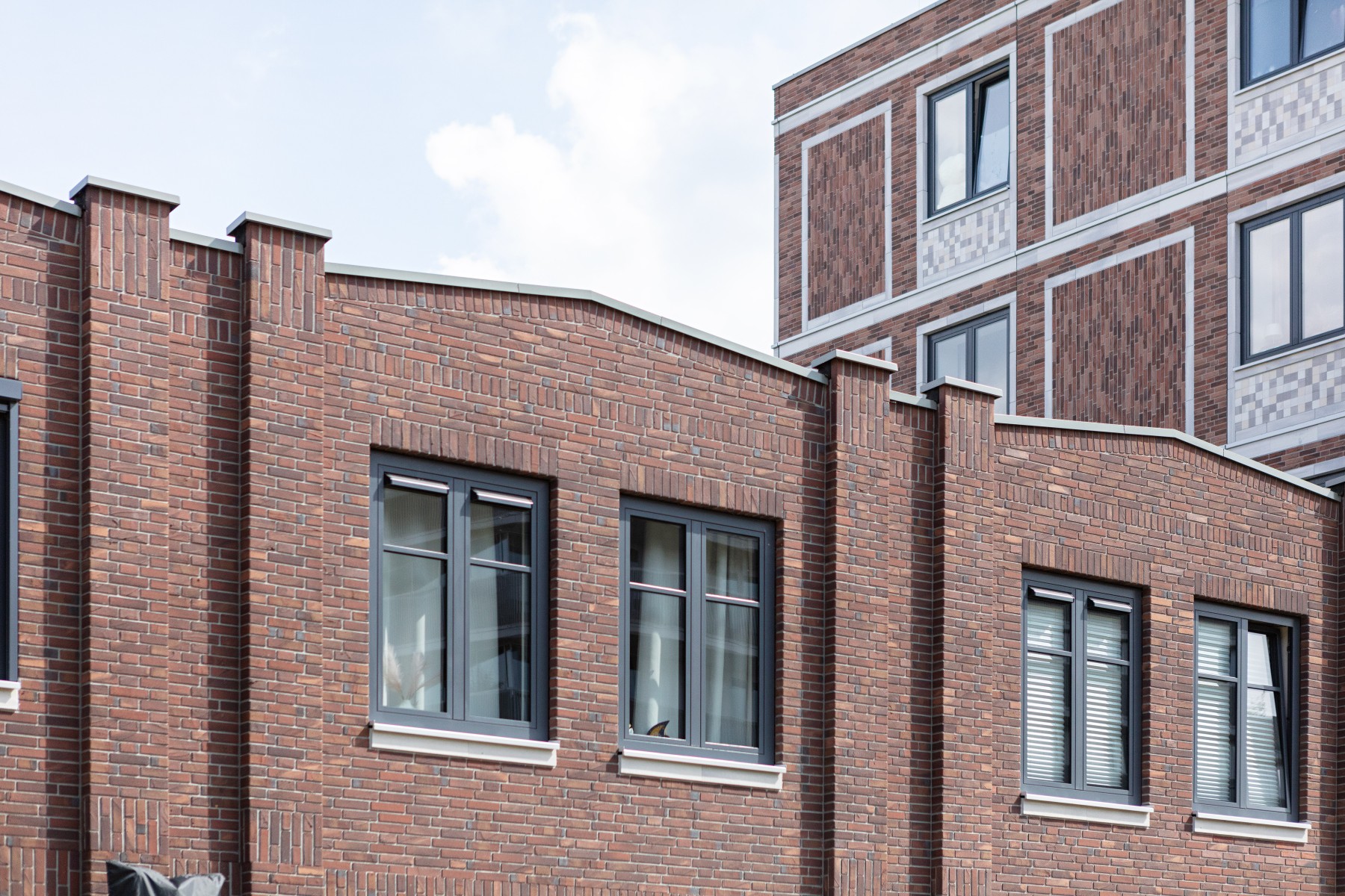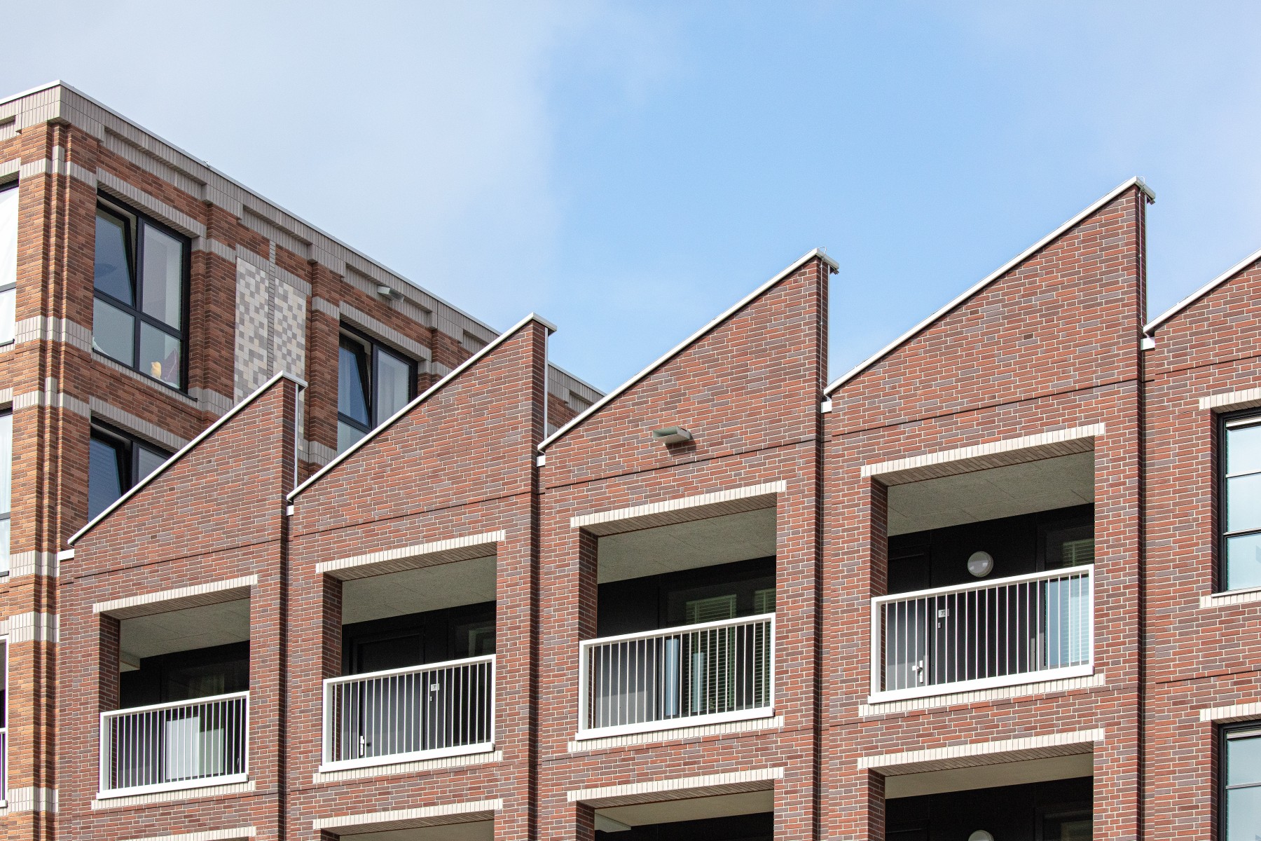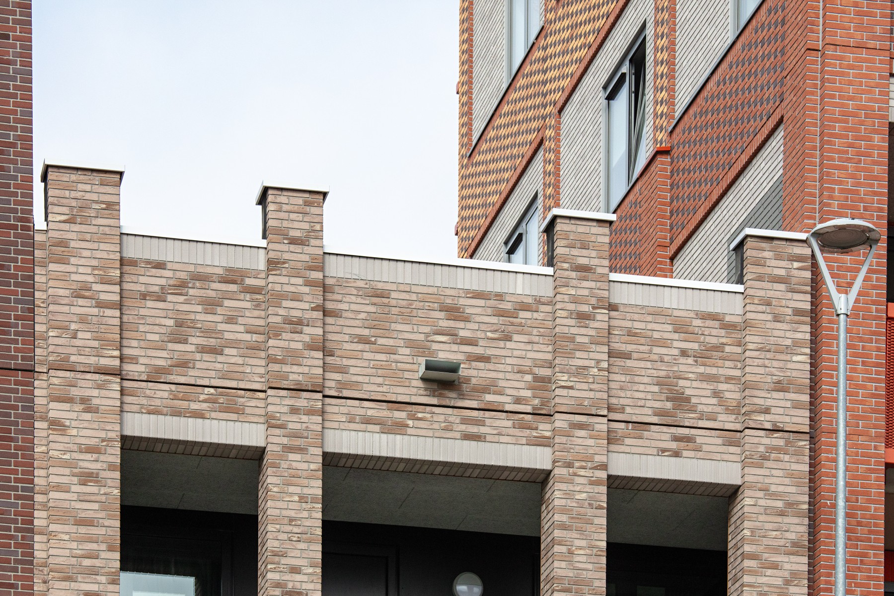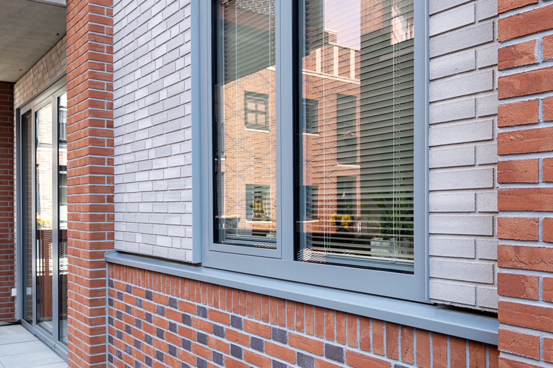 Voor de waterslagen en muurafdekkappen koos Joost bewust voor aluminium vanwege het gemak waarmee het materiaal gedetailleerd kan worden. De aluminium muurafdekkappen zijn op sommige locaties voorzien van balusters met railing, soms drie boven elkaar. “Aluminium muurafdekkappen zorgen voor een strakke afwerking bij randen waar bewoners dichtbij komen, zoals balkons en dakterrassen. Hier is aluminium niet alleen esthetisch aantrekkelijk, maar ook praktisch door zijn duurzaamheid en eenvoudig onderhoud. Bovendien konden we hiermee toch een beeld van traditionele betonarchitectuur op een lichte en innovatieve manier neerzetten, passend bij de houtskelet bouwmethodiek”, aldus Verbeek. Daarnaast heeft aluminium geholpen om horizontale naden tussen gevelpanelen te camoufleren. “Door slim aluminium zetwerk toe te passen, vallen her en der naden gericht weg in het ontwerp.”