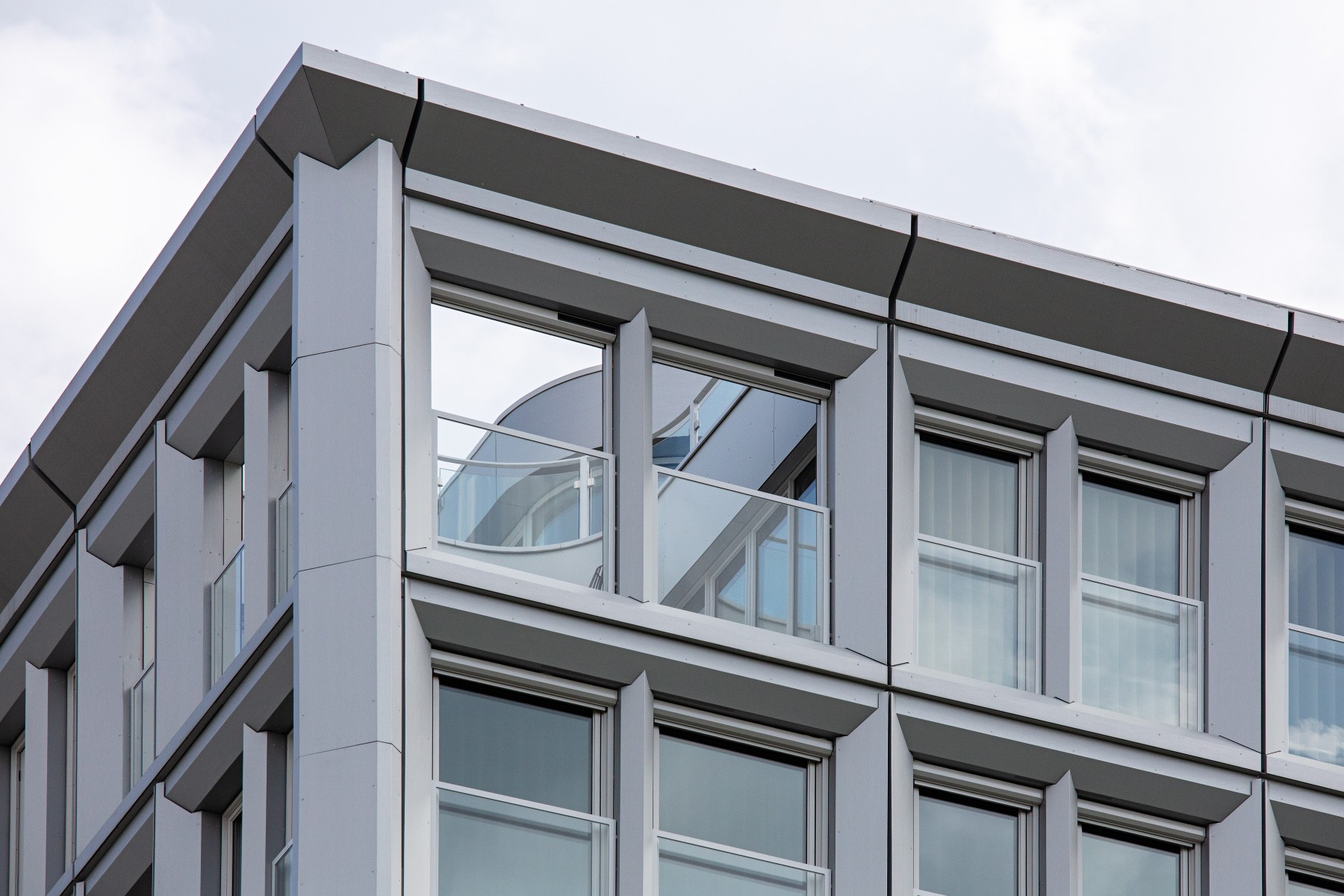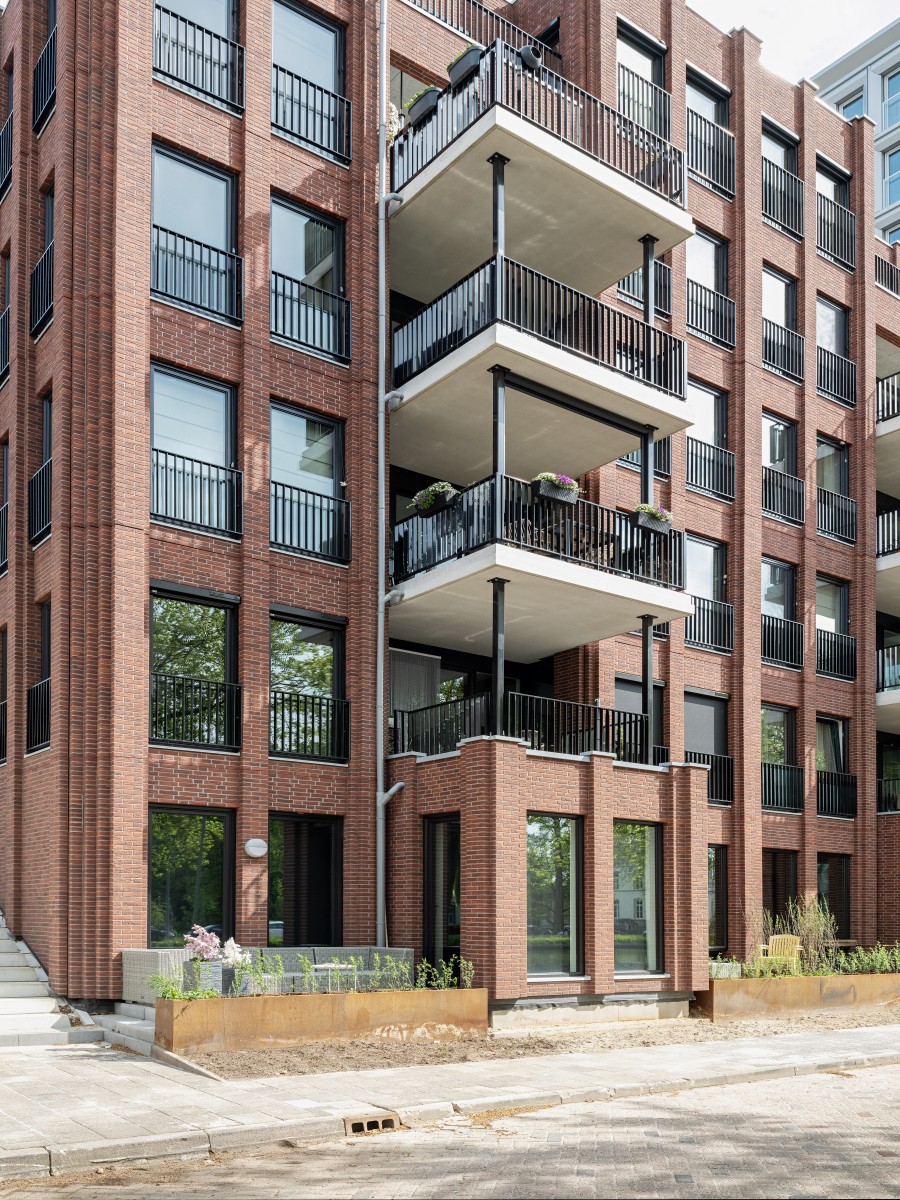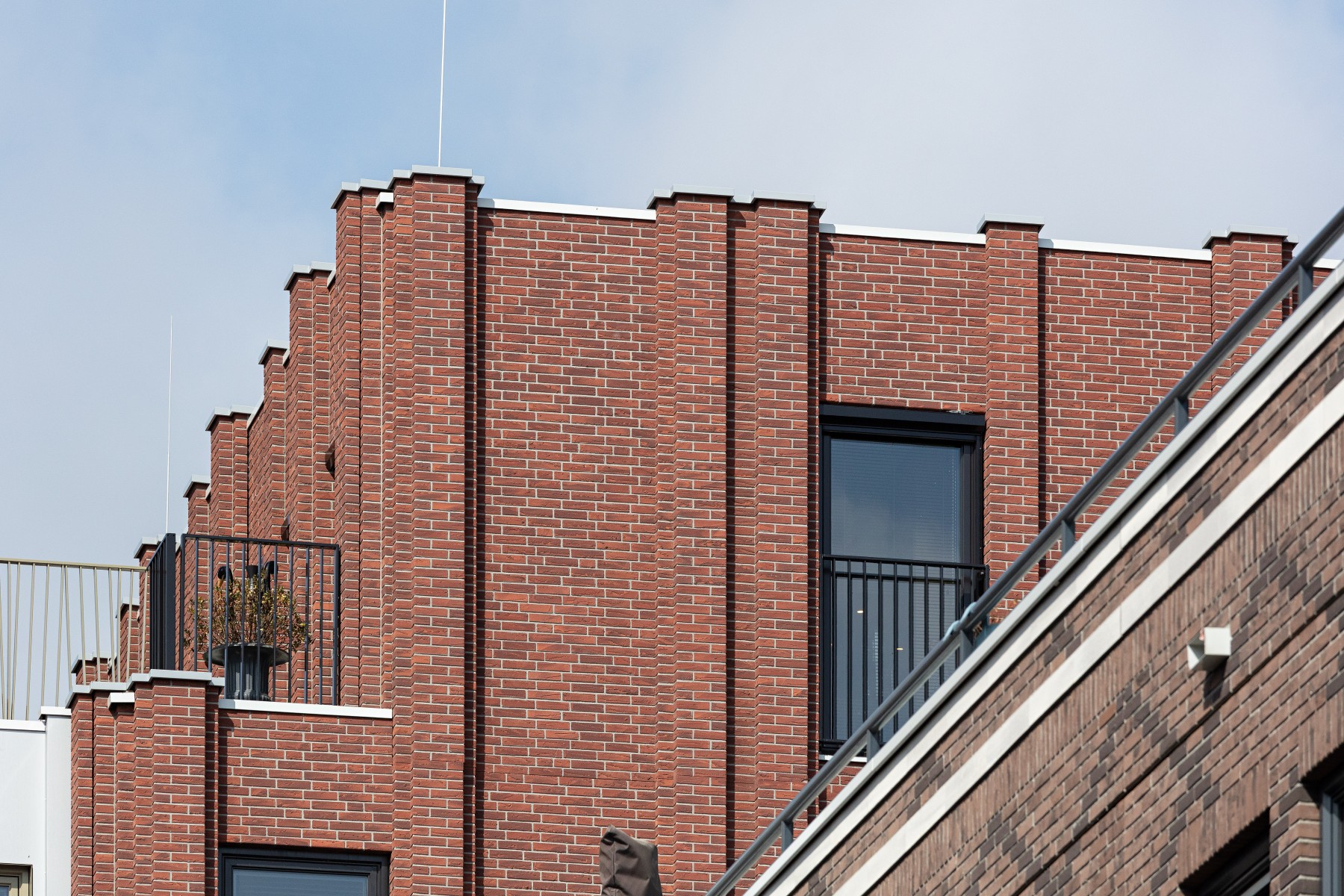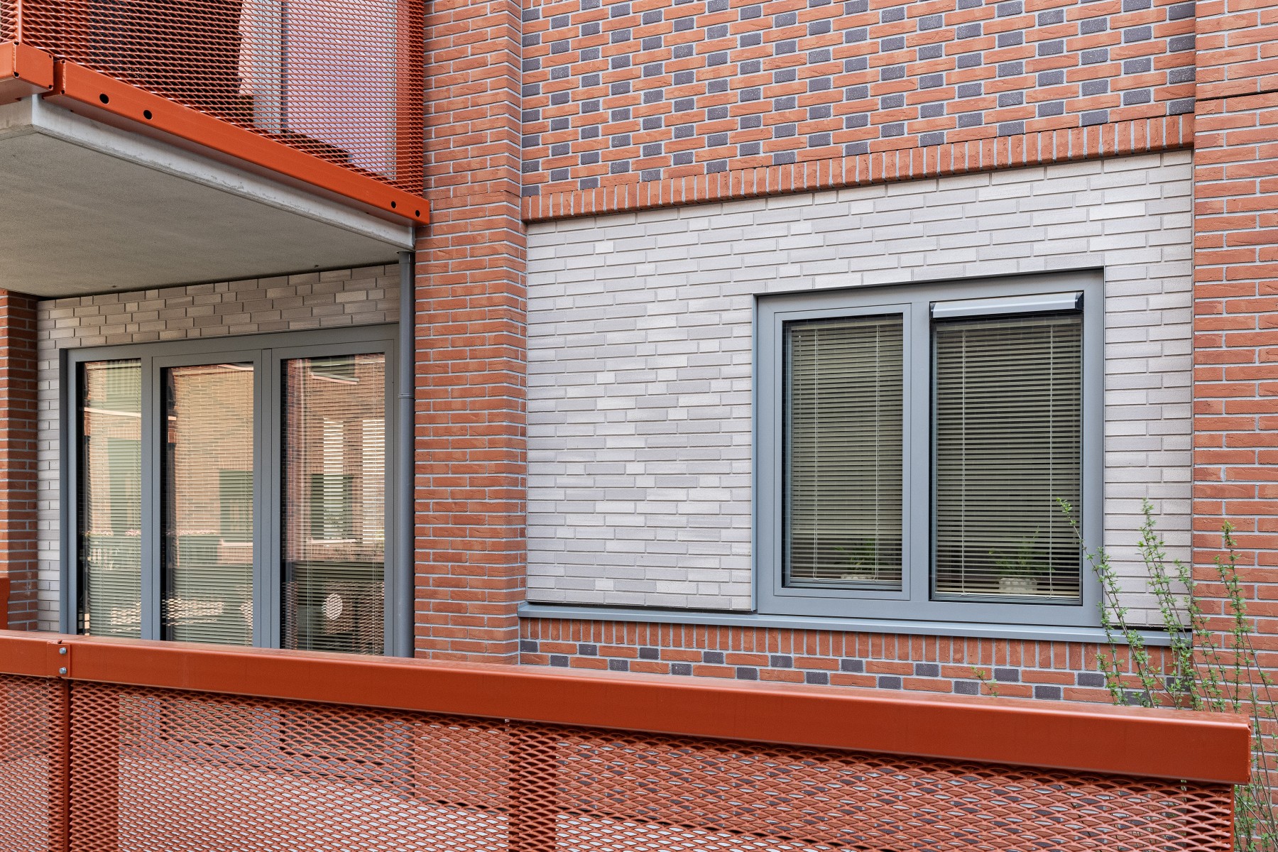 Voor de waterslagen en muurafdekkappen koos Joost bewust voor aluminium vanwege het gemak waarmee het materiaal gedetailleerd kan worden. De aluminium muurafdekkappen zijn op sommige locaties voorzien van balusters met railing, soms drie boven elkaar. “Aluminium muurafdekkappen zorgen voor een strakke afwerking bij randen waar bewoners dichtbij komen, zoals balkons en dakterrassen. Hier is aluminium niet alleen esthetisch aantrekkelijk, maar ook praktisch door zijn duurzaamheid en eenvoudig onderhoud. Bovendien konden we hiermee toch een beeld van traditionele betonarchitectuur op een lichte en innovatieve manier neerzetten, passend bij de houtskelet bouwmethodiek”, aldus Verbeek. Daarnaast heeft aluminium geholpen om horizontale naden tussen gevelpanelen te camoufleren. “Door slim aluminium zetwerk toe te passen, vallen her en der naden gericht weg in het ontwerp.”