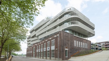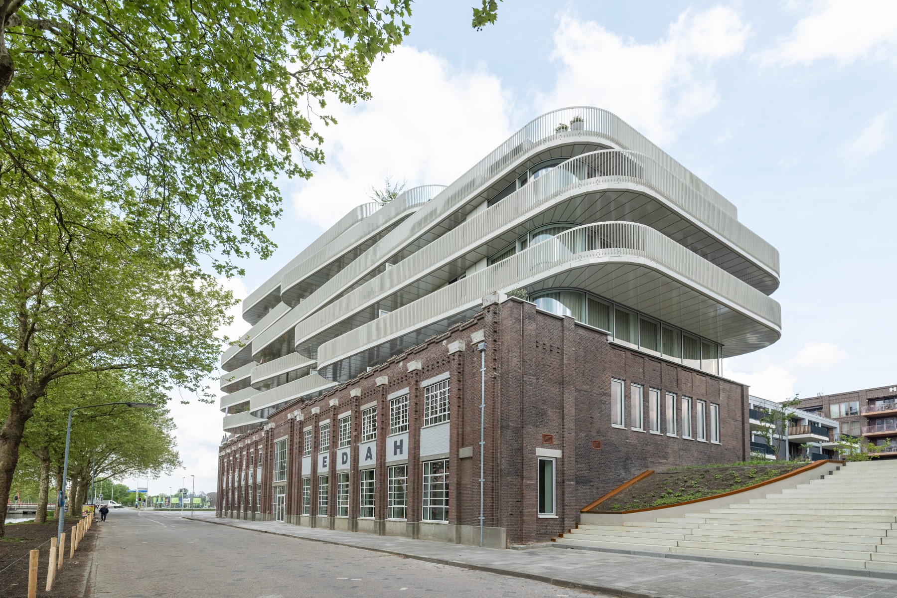 De monumentale gevel van het EDAH-pand zelf is zorgvuldig in ere hersteld. Het gehele pand is voorzien van een moderne, opvallende optopping. “Historische elementen, zoals raamkozijnen zijn uitgevoerd in het oorspronkelijk karakter in aluminium, terwijl we met de optopping iets nieuws wilden toevoegen”, zegt de architect. De ronde vormen van deze toevoeging, die doet denken aan de boeg van een schip, zijn geïnspireerd door het nabijgelegen kanaal en het nautische verleden van de locatie.”
